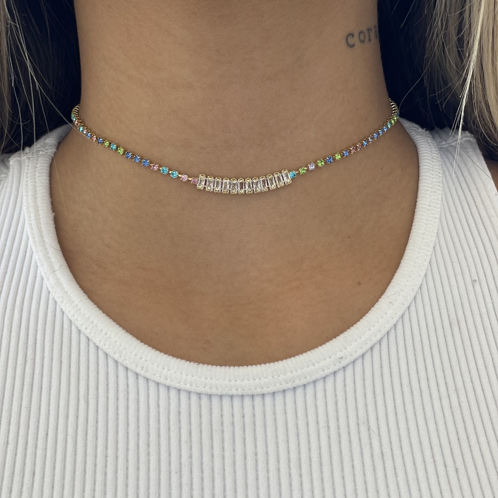 Choker folheada e cravejada com rivieras brancas e coloridas